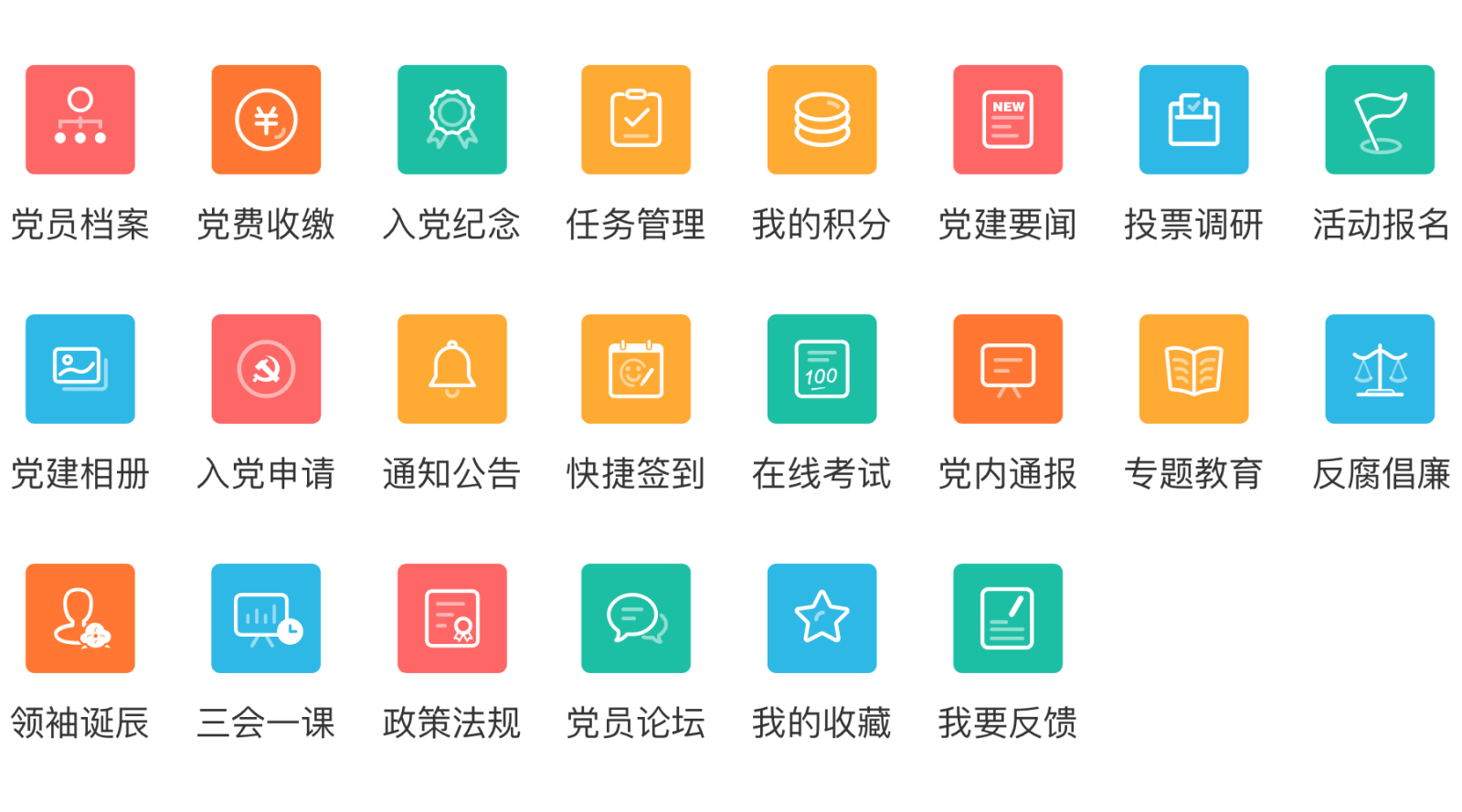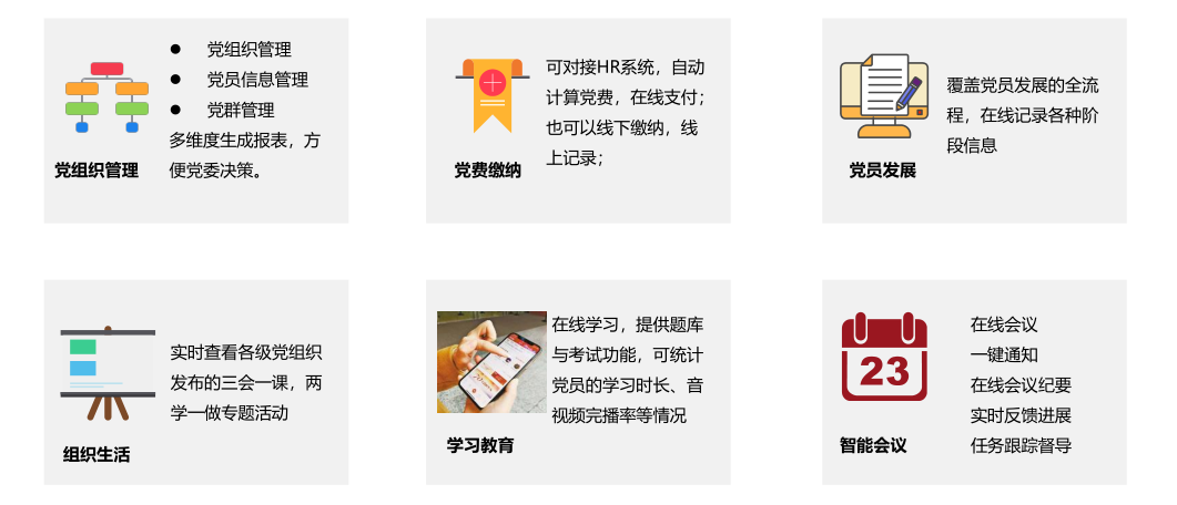 实现了党务会议召开、党务项目管理、项目任务安排、工作汇报、党员信息管理、党费缴纳上报、党费使用管理、党籍管理包括党员组织关系结转等的党务、党建管理工作流程化和办公电子化,系统支持电脑端和手机端等多种方式,可以随时接收随地消息和开展党务工作。